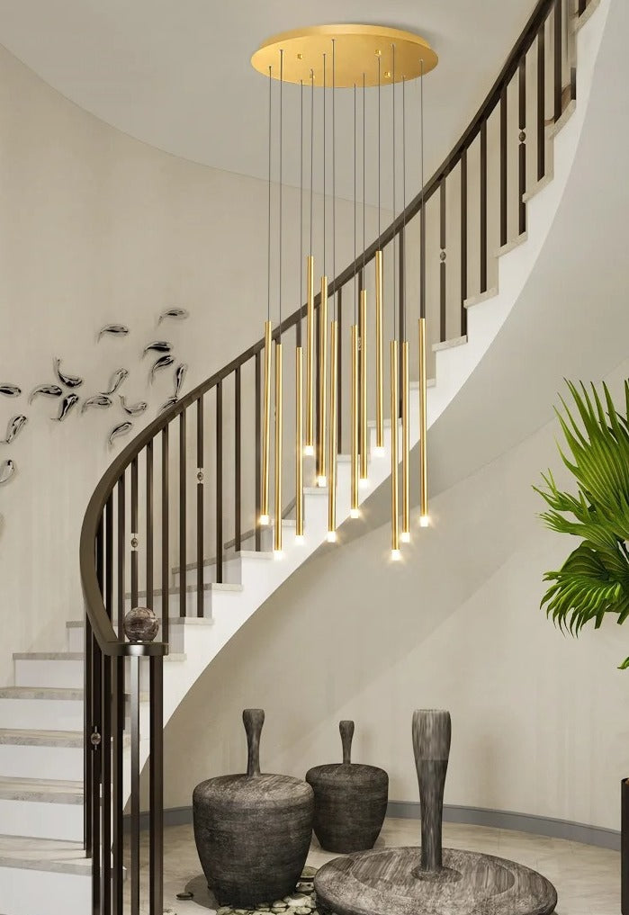 Our Alpha Trianguli Stair Chandelier is perfect for adding a touch of beauty and sophistication to your home. The unique metal and acrylic frame are combined with an attractive modern industrial charm to create a beautiful and unique design. This stair chandelier can be used in any room as it is perfect for adding a touch of elegance and professionalism to any space.