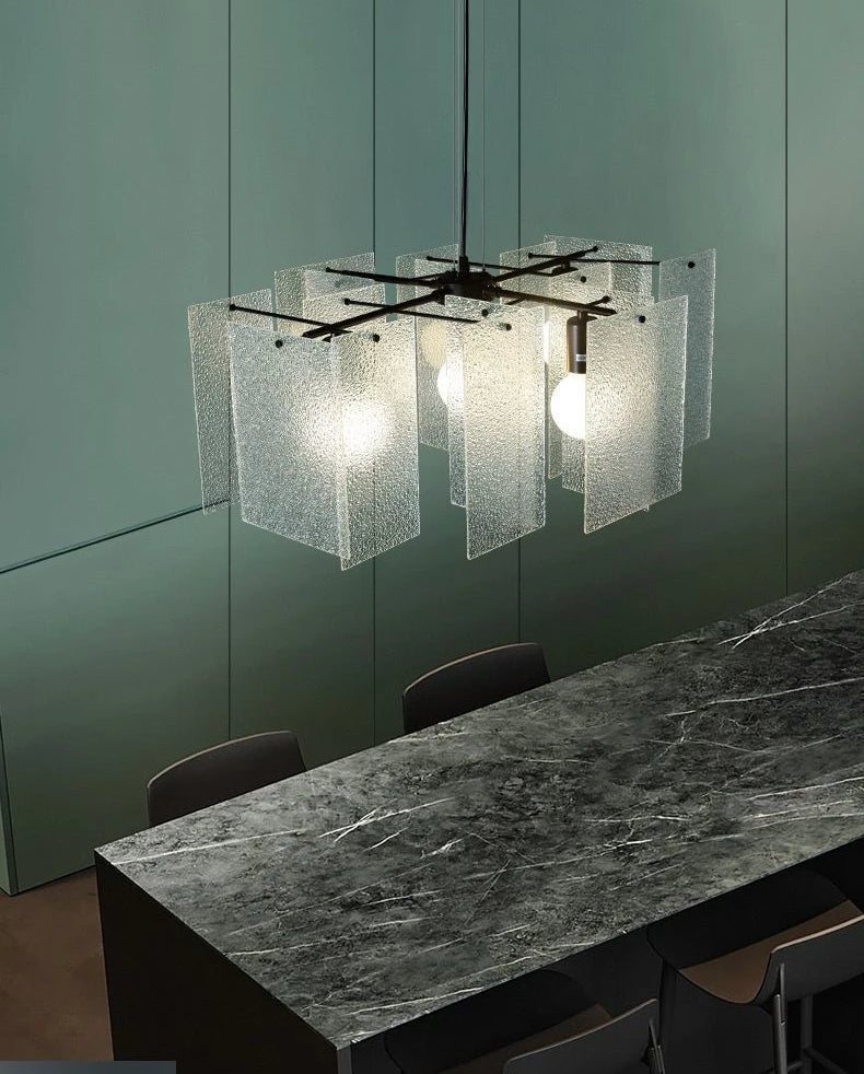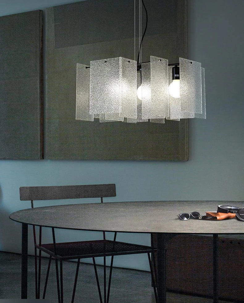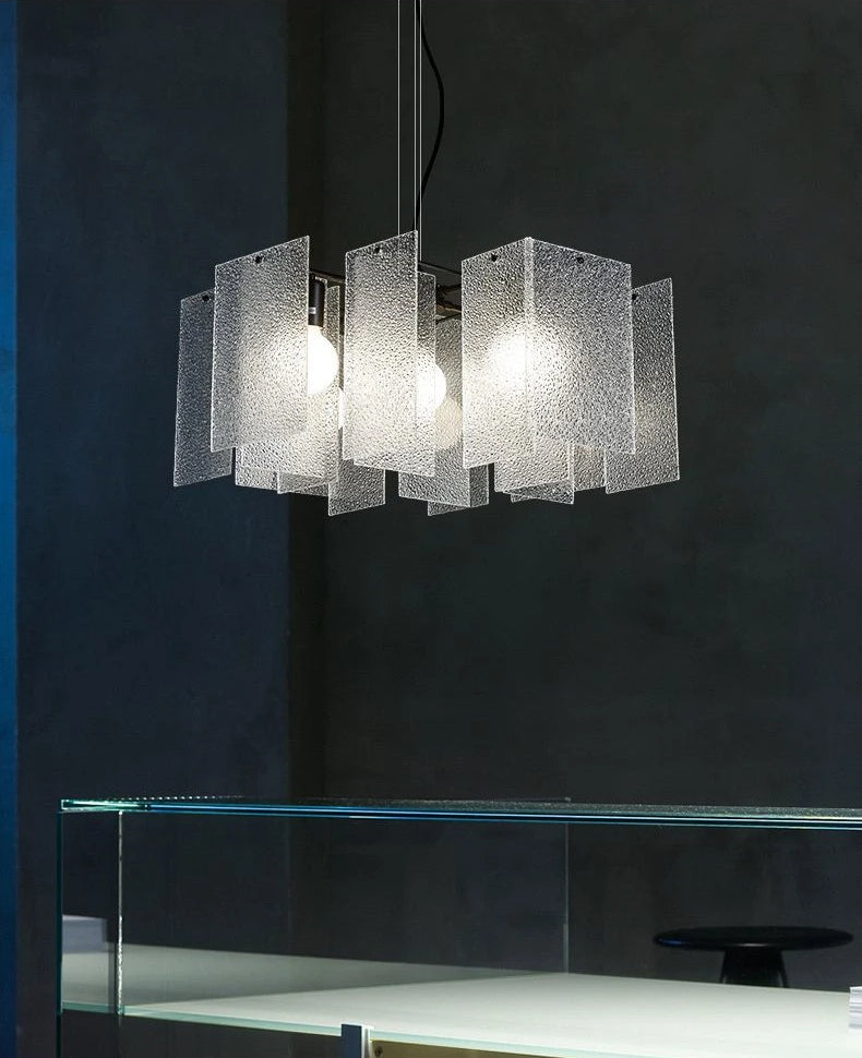 We offer a new concept of the lamp, created by overlapping thin fiberglass sheets. Using bigger sheets to build a lamp with a powerful theatrical presence. With its captivating light that is both lightweight and transparent, this lamp will add impact and personality to any setting. A Chandelier made from glass is a statement piece that will give your space an elegant and airy feeling. The delicate design is perfect for large spaces, such as hotel lobbies, meeting rooms, or gatherings places. With its grace and abstract style, this Chandelier adds a touch of elegance and modernity to any space.