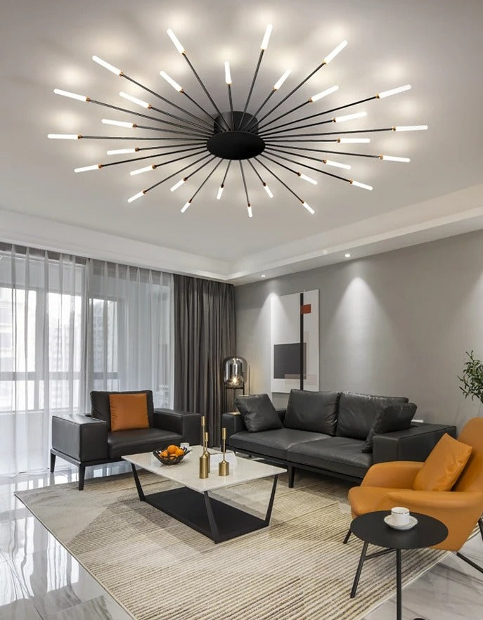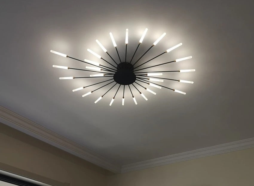 This unique LED ceiling light is a beautiful and unique firework-shaped chandelier. It will add a touch of occasion to any room, while also looking great on its own or in conjunction with other pieces of decor. The flush mount design creates a comfortable and modern ambiance, and the black gold finish gives it an elegant look.