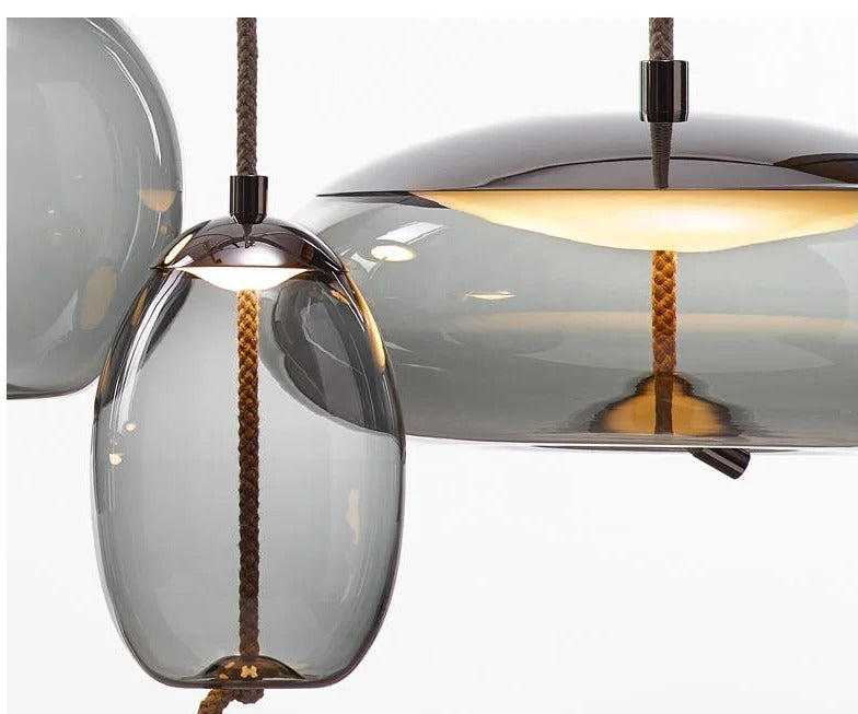 Miniature, delicate Nordic art glass lamps complete with a reflective finish of blown glass and a minimalist design. Appear as treatments for any space, adding elegance and personality to any room. Choose from two styles: one with coarse natural fiber and a smooth clear blown glass globe, while the other features a simple round etched base with an abstract design.