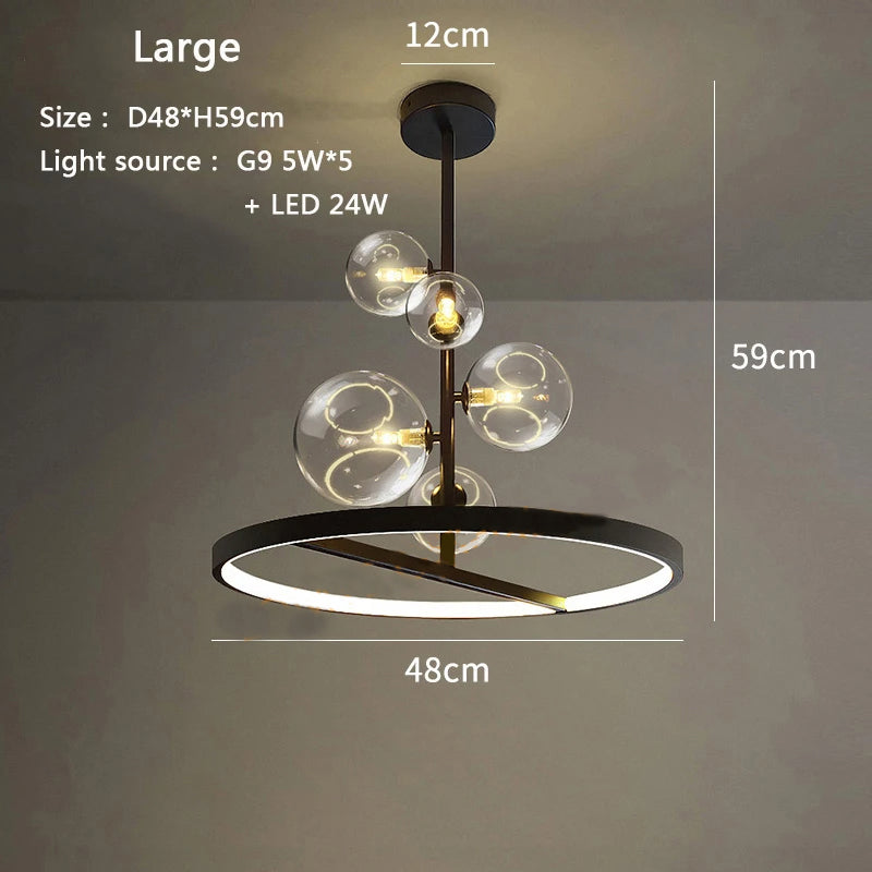 The Rigel Ball Chandelier a sophisticated contemporary design that captures the imagination. It features five uniquely sized glass lampshades with a LED ring, and it's perfect for any room in your home. The Clear Glass Ball Chandelier is perfect for adding a touch of elegance to any room. The wrought iron design and strong vibration-resistant glass make it an ideal choice for home or office use. The elegant finish color is sure to wow your guests.