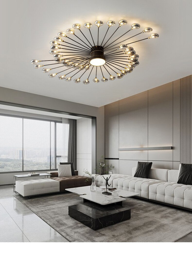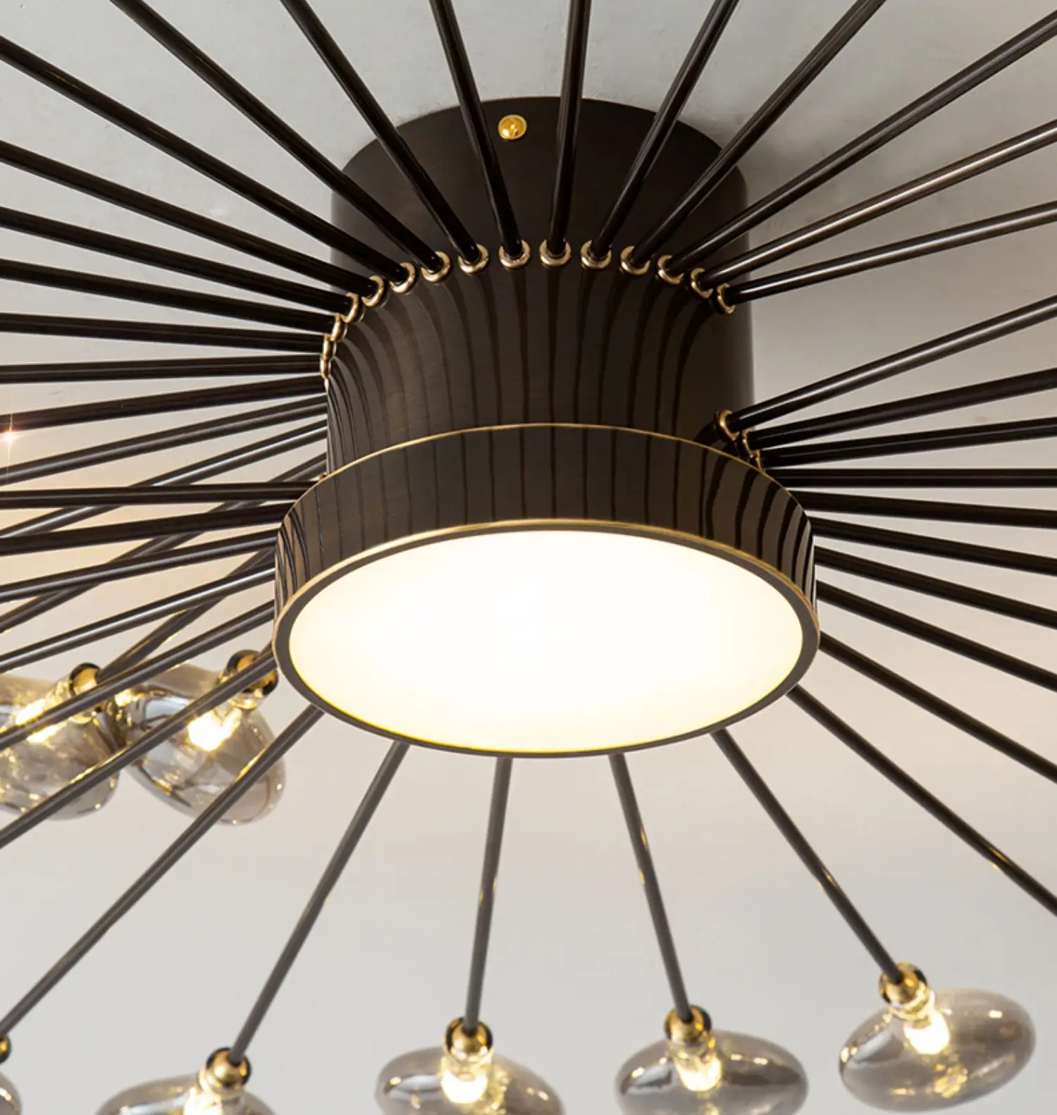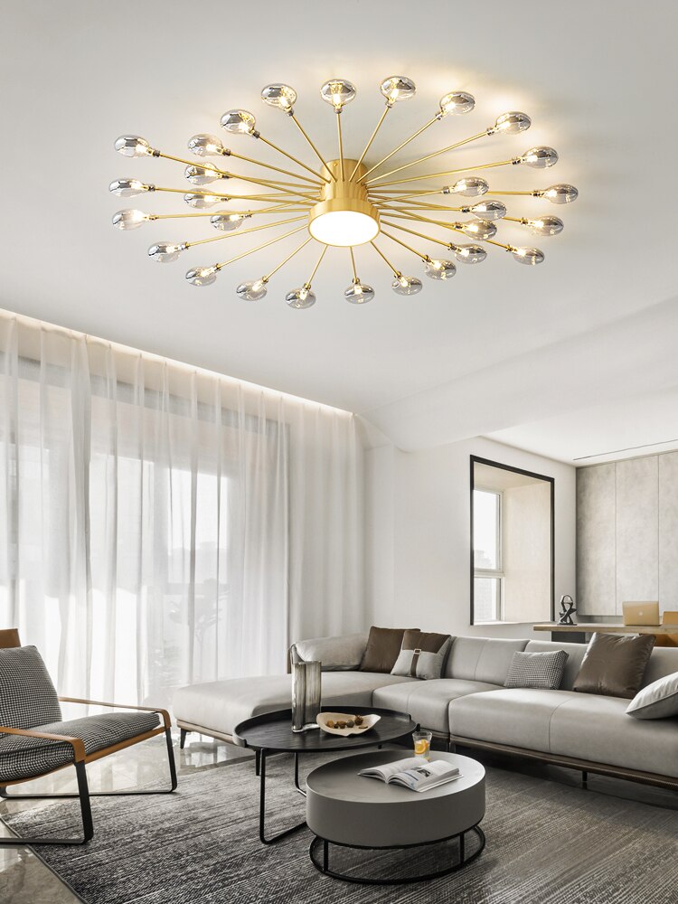 The Taygeta Ceiling Lamp is a luxurious and modern lighting fixture designed to elevate any living space. Made from all copper and glass, this lamp combines high-quality materials with a sleek design. Available in gold and black, it features a sealing glaze process for a refined finish.